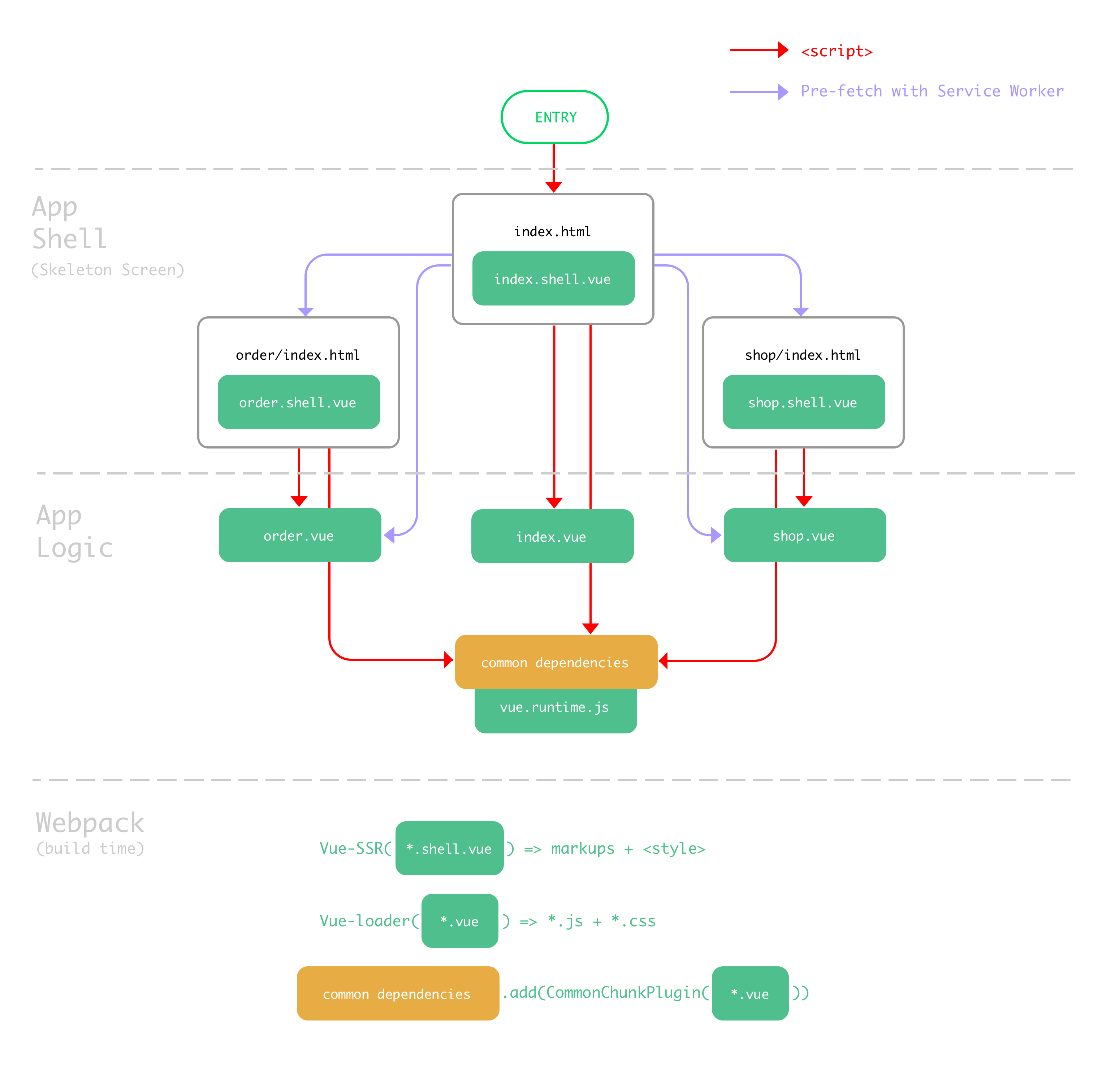而 Vue 的多才多艺就在这时体现出来了,我们真的可以用 Vue.js 的服务端渲染模块 来实现这个想法,不过不是用在真正的服务器上,而是在构建时用它把组件的空状态预先渲染成字符串并注入到 HTML 模板中。你需要调整你的 Vue 组件代码使得它可以在 Node 上执行,有些页面对 DOM/BOM 的依赖一时无法轻易去除得,我们目前只好额外编写一个 *.shell.vue 来暂时绕过这个问题。