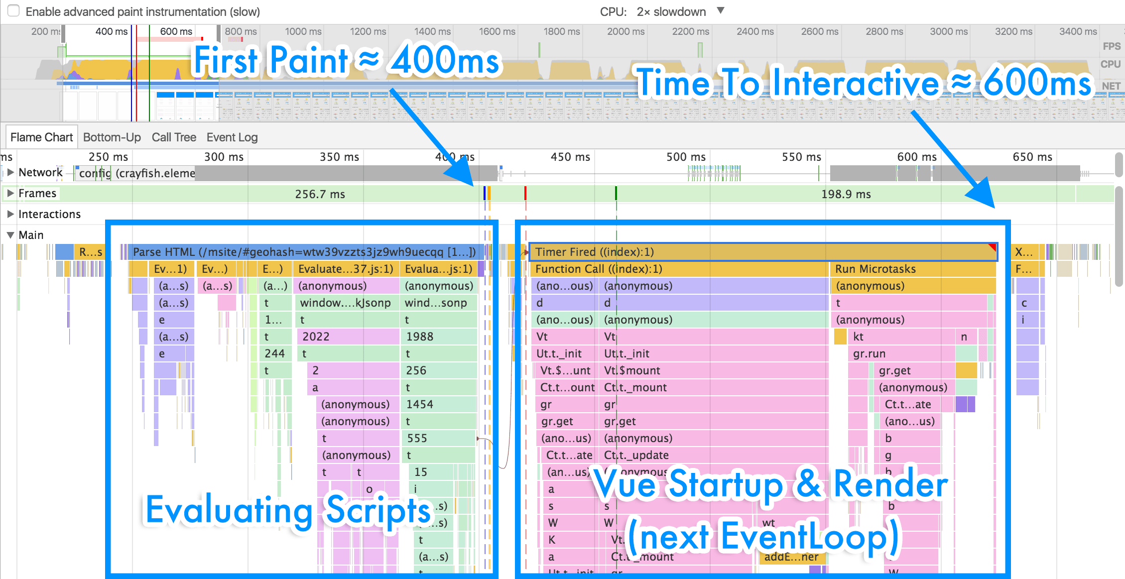 According to the profile, most of the time (900ms) before hitting the first paint is spent on evaluating JavaScript. Half is on dependencies including Vue Runtime, components, libraries etc., another half is on actual Vue starting-up and mounting. Because all UI rendering is depended on JavaScript/Vue, all of the critical scripts remain guiltily parser-blocking. I’m by no means blaming JavaScript or Vue’s overheads here, It’s just a tradeoff when we need this layer of abstraction in engineering.